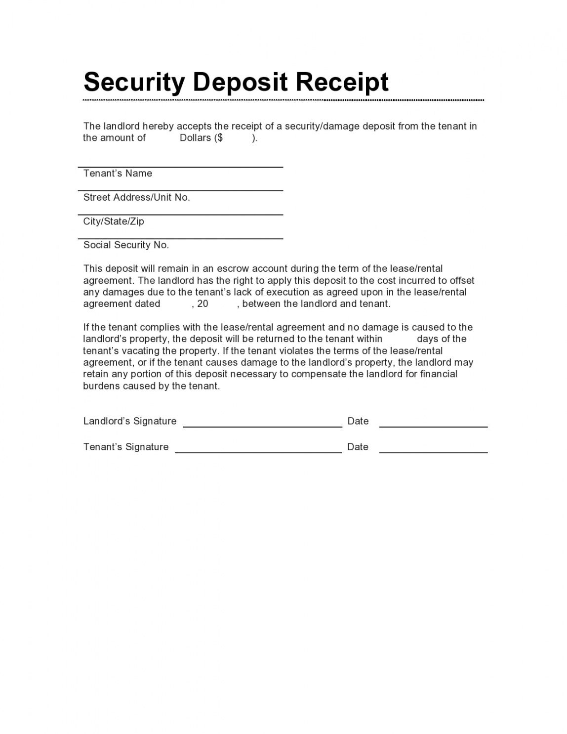 sample 29 editable security deposit receipts pdfword biggerpockets security deposit template excel