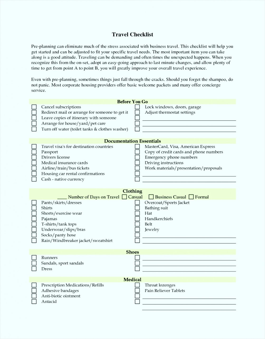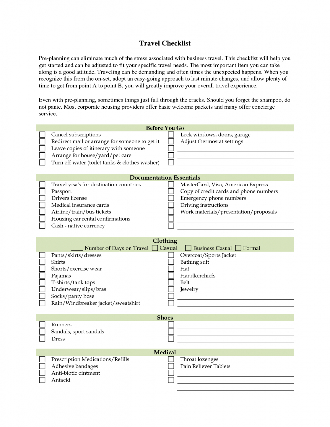 Business travel checklist template, Historically, checklists were simple to-do lists that functioned as reminders; attend the revenue conference, fax or email the contract to an individual customer, or submit an employee memo. Even today, most dictionaries define a checklist for a record that acts as a reminder for a series of jobs to be completed. However, checklists have evolved to important business management tools that do much more. In addition to record action items, checklists are powerful business processes that enable organizations to grow and progress systematically, and in a planned way. They’ve become important organizational tools for business enterprises.