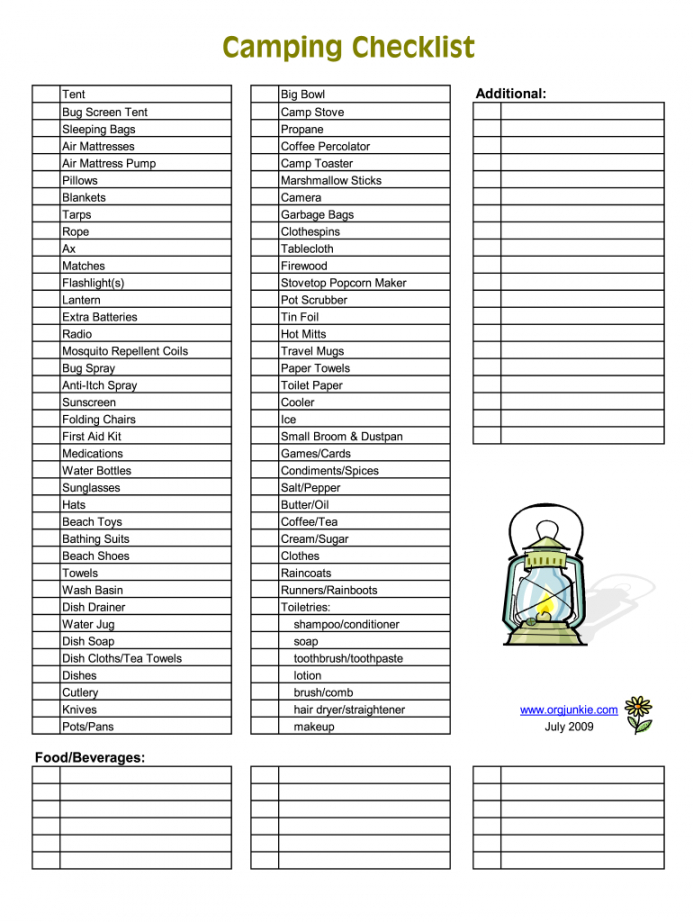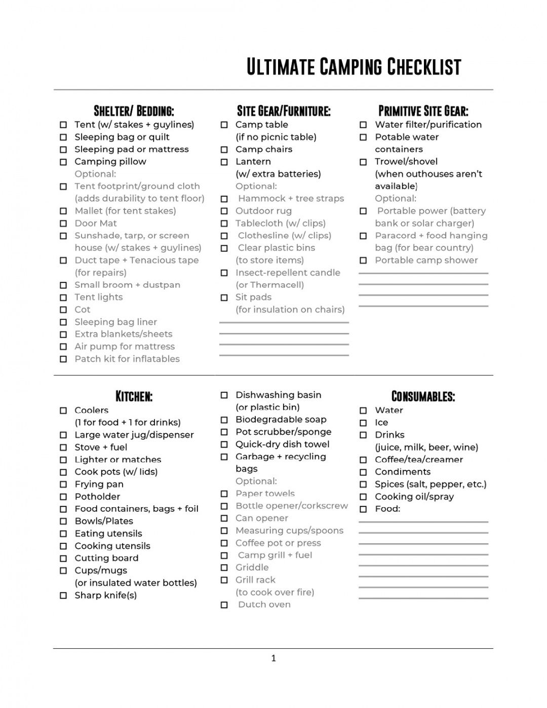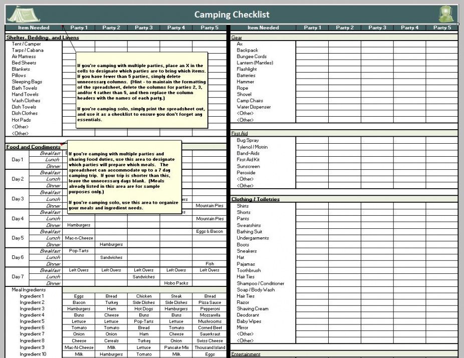 Camping checklist template, For a lot of men and women, as they become older, their needs vary dramatically. Based on a person’s age, health and mental capacity, there might be many things that a grownup just can not keep up with exactly the way they used to, or many things a Boomer doesn’t have (can you say”Advanced Directives”) and does not understand they need until it is too late. We believe that among the most effective methods of getting boomers ready for their futures, and to maintain seniors arranged in the current, is by equipping them with checklists that cover key areas of their life. We think that while checklists may not have the moment particulars laid out (checklists are meant to deliver succinct advice), they’re an excellent preparation tool which provide folks a macro-view of what has to be learned, gathered, prepared, and ultimately implemented, especially when preparing for the unexpected moment; moments where without a strategy set up becomes a crisis situation.