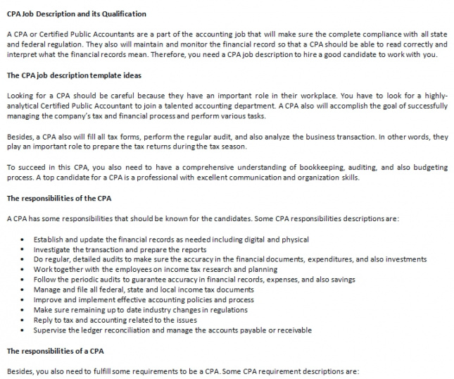 Chief accountant job description template, The right job description can assist your recruitment process run smoothly. It can bring in the kind of candidates you desire, and can also market your brand. The work description has three chief purposes. It can help to bring candidates with the skills you need. It defines the terms of the work role and the duties that the candidate will choose on. Plus it can be utilised as a reference source, which is particularly useful when it is the right time to carry out appraisals.