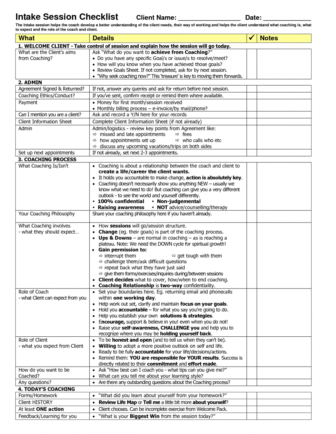 Coaching checklist template, For many men and women, as they become older, their needs change radically. Based on a individual’s age, health and psychological capacity, there might be several things that a senior just can not keep up with the way that they used to, or many things a Boomer doesn’t have (can you say”Advanced Directives”) and doesn’t know they need until it’s too late. We believe that one of the best methods of getting boomers prepared for their futures, as well as to keep seniors organized in the current, is by equipping them with checklists that cover major areas of their life. We believe that while checklists might not have the minute particulars laid out (checklists are supposed to deliver concise advice), they’re an excellent preparation tool that give people a macro-view of what has to be learned, gathered, ready, and ultimately implemented, particularly when planning for the unexpected moment; seconds where without a strategy set up becomes a crisis situation.