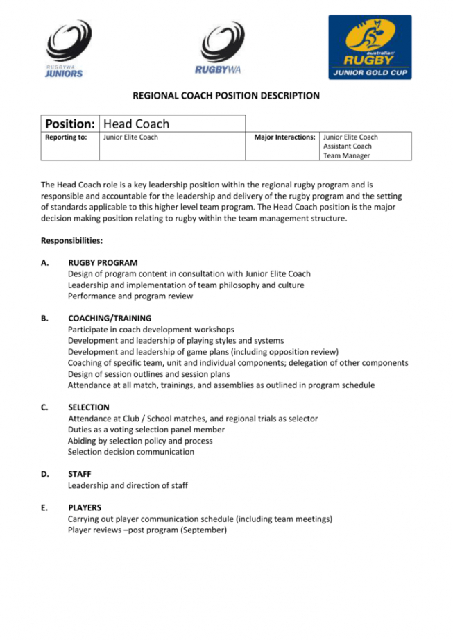 Coaching job description template, Job descriptions are all critical to your business only because they specify job duties and expectations. Job descriptions may be utilised in several of methods in your small business. First, a description will enable a candidate decide if the job is of interest. Secondly, the description can allow you to interview the candidate to decide whether the candidate is suitable for the position. The job description will be able to help you in training new employees. Ultimately, the description forms the backbone of your evaluation and inspection process.