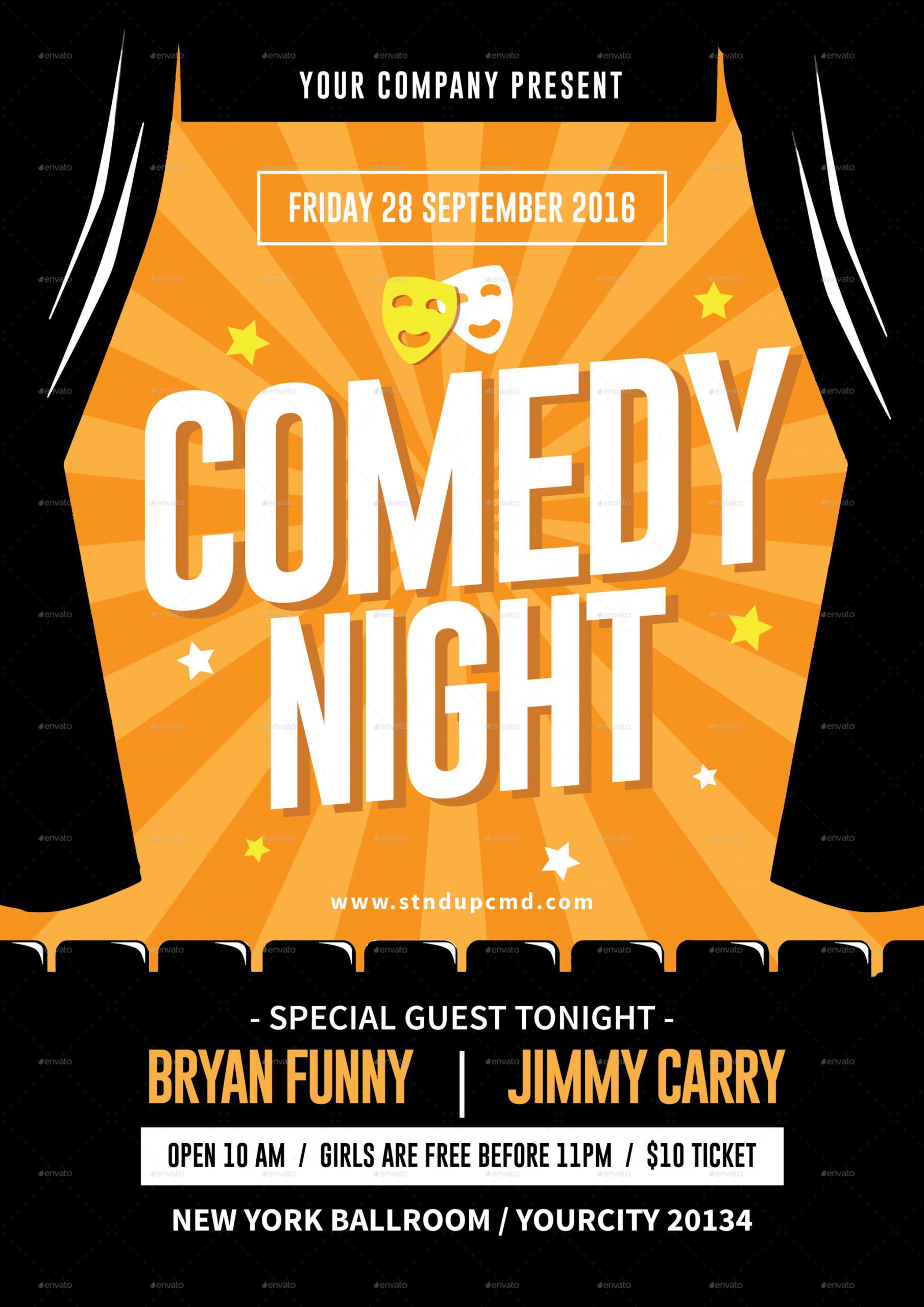 Comedy show flyer template, Flyers are the most effective form of neighborhood marketing. Production costs are reduced, and it is frequently possible to discover students who can distribute the flyers at reduced hourly wages. Flyers are an effective means of promotion for events and business specials. Careful selection of location and careful selection of personnel can insure an effective and inexpensive flyer distribution. The perfect way to spread your flyers is to put them up in local colleges, small businesses, and neighborhood associations. A potent community presence is of the utmost importance for merchants or little companies. In the event the neighborhood enterprise is encouraged and appreciated by the local community, then you’ll have a trusted cash flow coming and also a powerful basis for future expansion.
