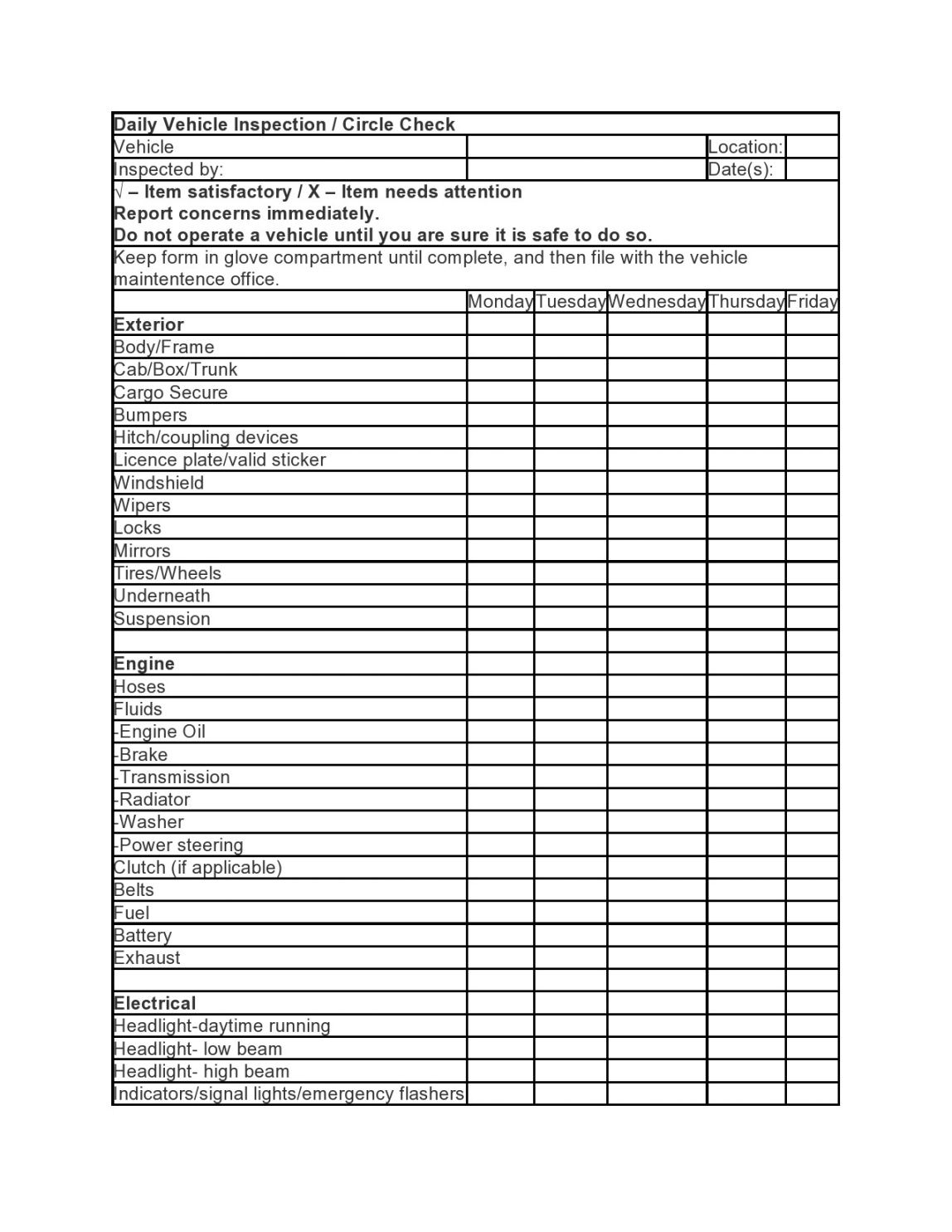 Company vehicle inspection checklist template, For most of us life is a constant battle to remain organized, we write lists of those things we need to and once we need to have them done. But when the tasks we have to get done get a little more complicated a good checklist may come in handy to make sure everything gets done correctly. Using a template for a checklist you can create detailed lists which include groupings of particular tasks and checklists to be certain you receive each task done in the appropriate order and lessen the risk of mistakes being made.