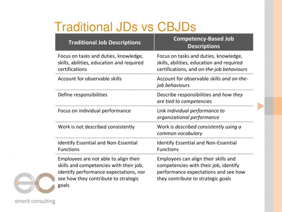 Competency based job description, Job descriptions are imperative to your company since they define job responsibilities and expectations. Job descriptions may be utilised in several of ways in your business. First, a description will aid a candidate decide whether the task is of interest. Secondly, the description can help you join the candidate to decide if the candidate is ideal for the position. The project description will be able to help you in training new employees. Last, the description forms the backbone of your test and inspection process.