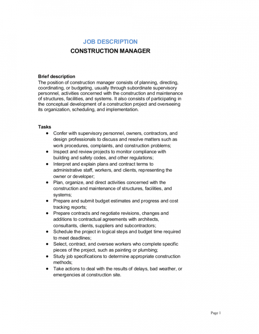Construction project manager job description template, The ideal job description can assist your recruitment process run smoothly. It may bring in the sort of candidates that you desire, and can also promote your brand. The job description has three main purposes. It will help to attract candidates with the skills you require. It defines the conditions of the job function and the responsibilities that the candidate will accept on. Plus it may be utilised as a reference resource, which is particularly useful when it’s time to perform appraisals.
