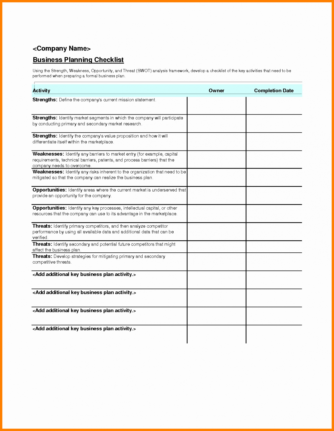 Business checklists allow you to evaluate organizational objectives, and prioritize goals so that as you are managing all of the high priority activities, the smaller yet necessary tasks are also incorporated and dealt with. They permit you to stick to the planned course of action and recognize deviations prior to any negative eventualities occur. Moreover, it is important for any business entity to move faster than its competitors. By prioritizing and organizing action items and programs, checklists enable the enterprise to save time and stay abreast, even ahead, of its industry.