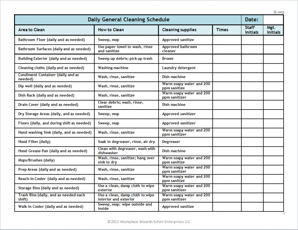 Daily kitchen cleaning checklist template, Historically, checklists were simple to-do lists that served as reminders; attend the revenue conference, fax or mail the contract to a client, or submit a worker memo. Even today, most dictionaries define a record as a document that serves as a reminder for a series of jobs to be finished. But, checklists have evolved to important business management tools which do much more. In addition to listing action items, checklists are powerful business processes that enable organizations to grow and progress systematically, and in a planned way. They’ve become important organizational tools for both business enterprises.