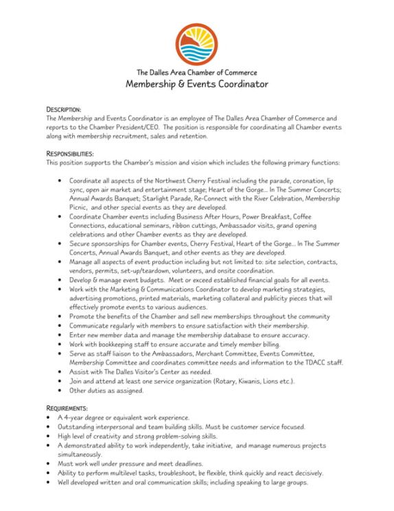 Event coordinator job description template, The right job description can assist your recruitment process run smoothly. It can draw the kind of candidates you desire, and can also market your brand. The job description has three main functions. It can help to bring candidates with the skills which you need. It defines the details of the work role and the duties that the candidate will choose on. And it can be used as a reference resource, which can be very useful when it’s time to carry out appraisals.