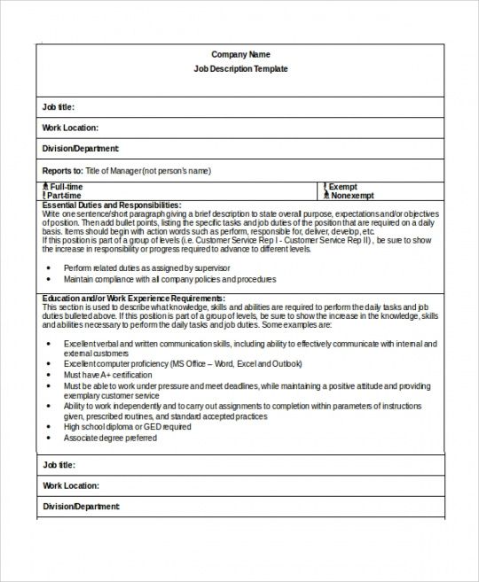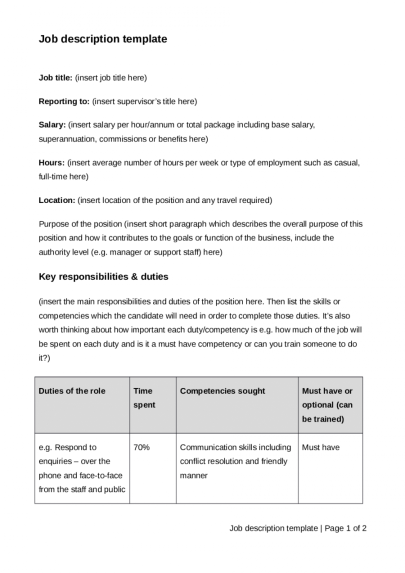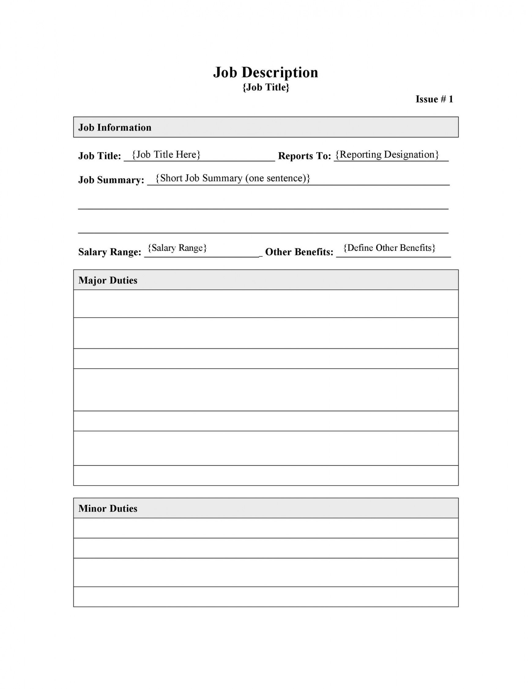 Example job description template, The right job description can aid your recruiting process run smoothly. It may bring in the sort of candidates you want, and may also promote your brandnew. The work description has three chief functions. It can help to bring candidates with the skills which you need. It defines the details of the job role and the duties the candidate will take on. Plus it can be used as a reference resource, which is particularly useful when it is the right time to carry out appraisals.