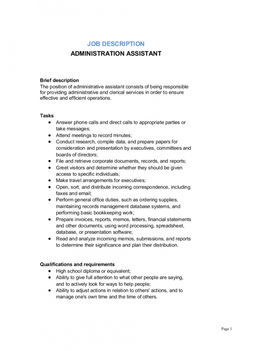 Executive assistant job description template, Job descriptions are also imperative to your business only because they define job duties and expectations. Job descriptions can be utilised in several of ways in your business. First, a description will help a candidate decide if the task is of interest. Second, the description will allow you to interview the candidate to determine whether the candidate is ideal for the position. The project description can assist you in training new employees. Last, the description forms the backbone of your evaluation and inspection process.