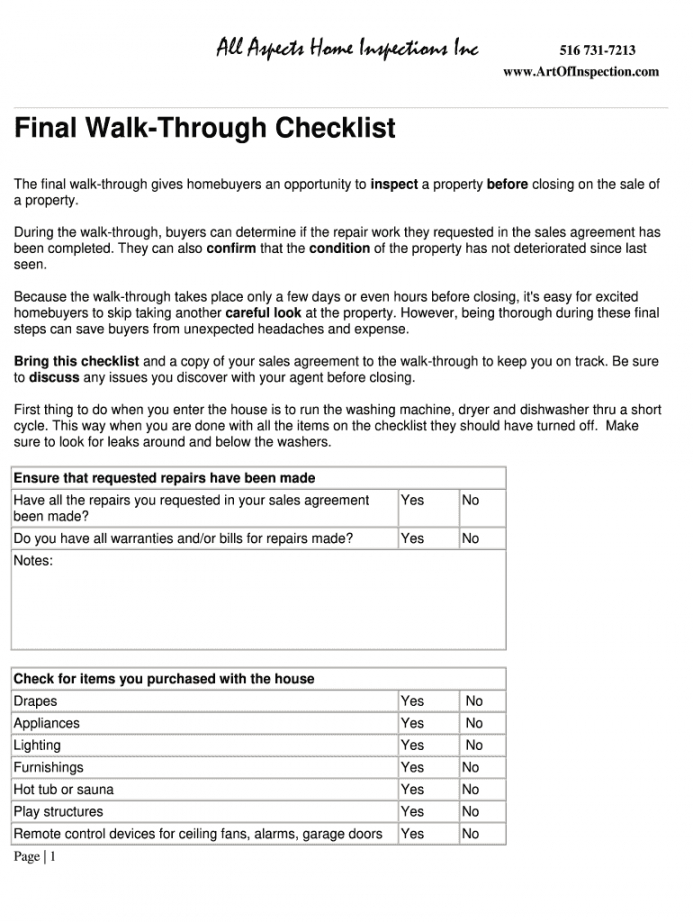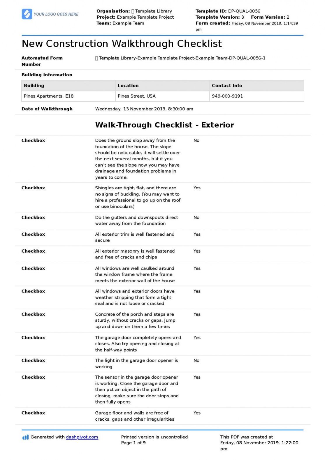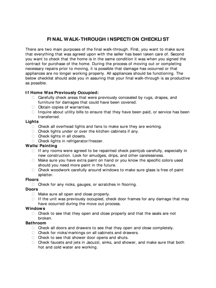 Final walk through checklist template, Historically, checklists were straightforward to-do lists that served as reminders; attend the sales seminar, fax or email the contract to an individual client, or submit an employee memo. Even today, most dictionaries define a record for a document that acts as a reminder for a collection of jobs to be finished. But, checklists have now evolved to significant business management tools which do far more. In addition to record action items, checklists are effective business processes that empower organizations to grow and progress systematically, and in a planned way. They’ve become significant organizational tools for business ventures.