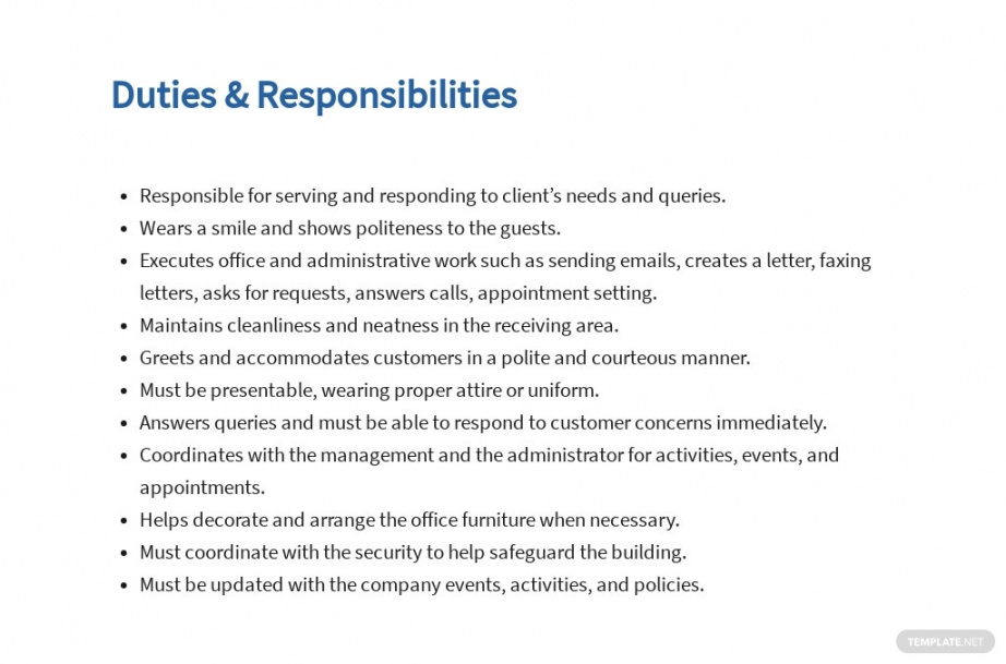 Front desk job description template, Among the many responsibilities of a human resources specialist, hiring fresh competent employees is among the most important. After carefully assessing the competency design your organization wants, you’ll be able to determine the particular qualities that prospective workers should have – the skills and qualities which are most important to a particular function or the other. Once you’ve carefully created your hiring criteria, the upcoming essential step is that the description.