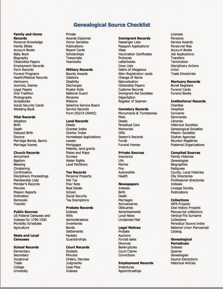 Genealogy research checklist template, Historically, checklists were simple to-do lists that functioned as reminders; attend the sales seminar, fax or email the contract to a client, or submit a worker memo. Even today, most dictionaries define a checklist for a document that acts as a reminder for a series of tasks to be finished. But, checklists have now evolved to important business management tools that do much more. In addition to listing action items, checklists are effective business processes that enable organizations to raise and progress methodically, and in a planned way. They’ve become significant organizational tools for business enterprises.