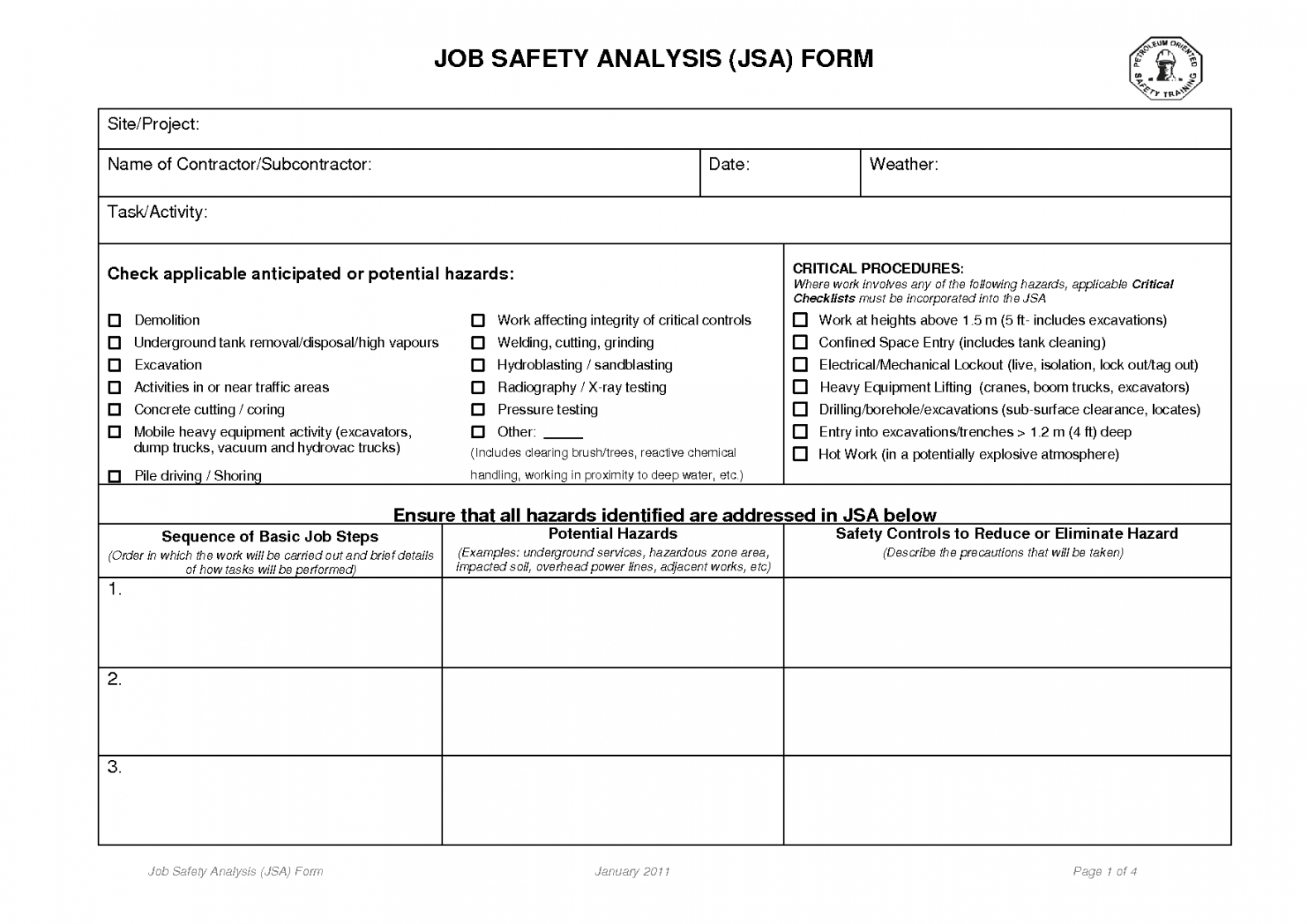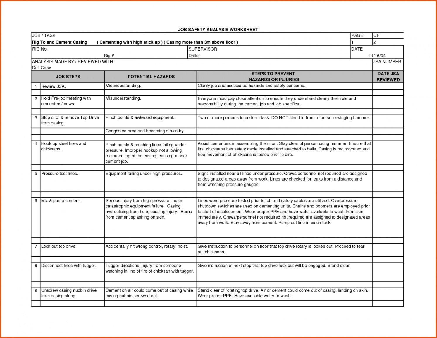 Job Safety Analysis Worksheet Template