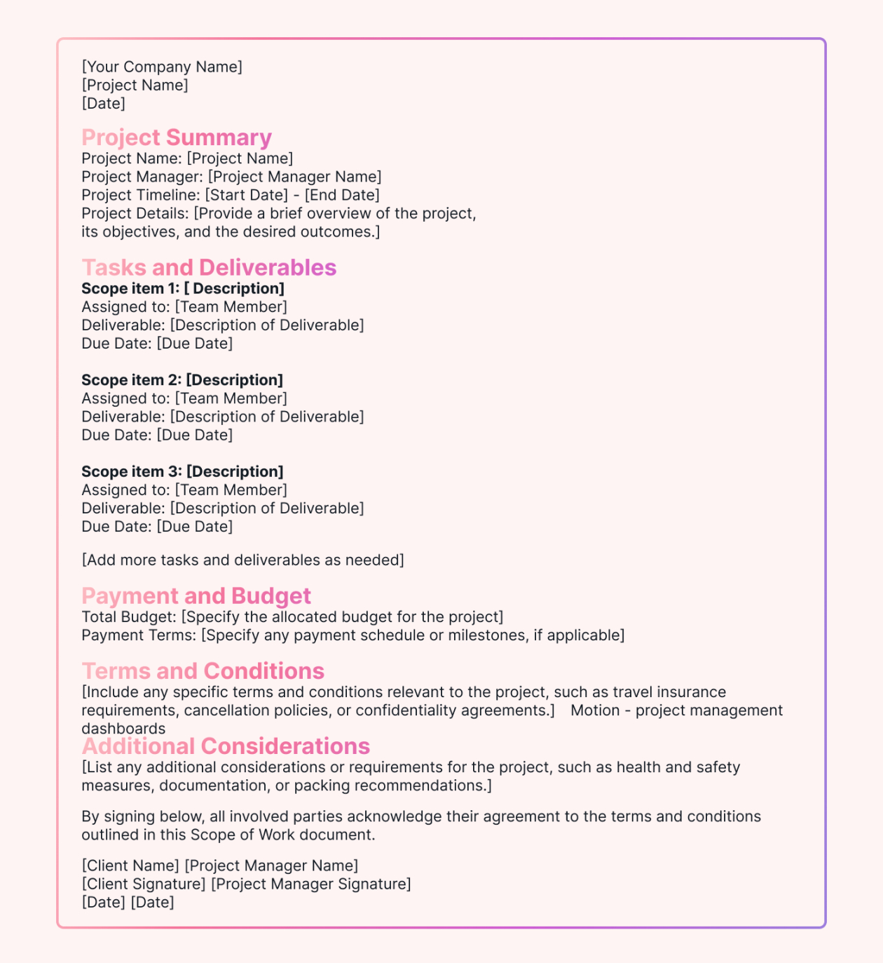 Writing a complete project scope doesn’t have to be a difficult chore. In fact, with the appropriate support, it can be a smooth process. A well-crafted SOW not only details the project deliverables, schedules, and budget, but also aligns goals for all parties concerned. It acts as a clear roadmap, minimizing misunderstandings and keeping all parties on track on the project goals. Without a structured scope of work, projects can easily lose focus, leading to missed deadlines, budget overruns, and dissatisfied clients.