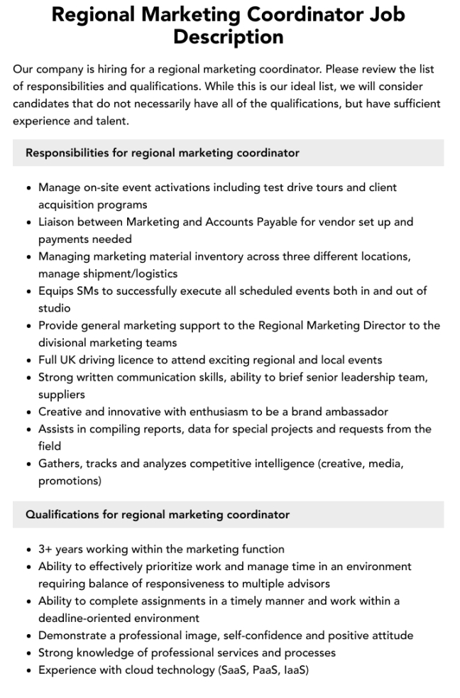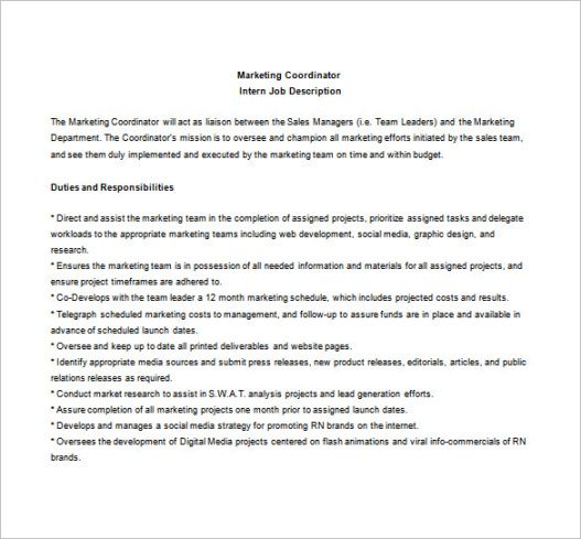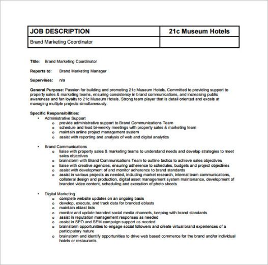 Marketing coordinator job description template, The ideal job description can assist your recruitment process run smoothly. It may bring in the kind of candidates that you want, and may also market your brand. The job description has three main purposes. It helps to bring candidates with the skills which you require. It defines the terms of the work function and the duties that the candidate will accept on. And it may be used as a reference source, which is particularly useful when it’s the right time to perform appraisals.
