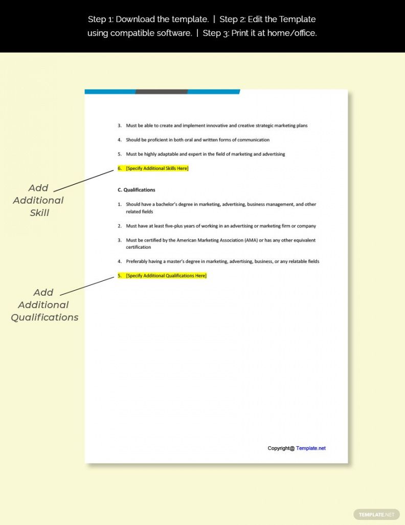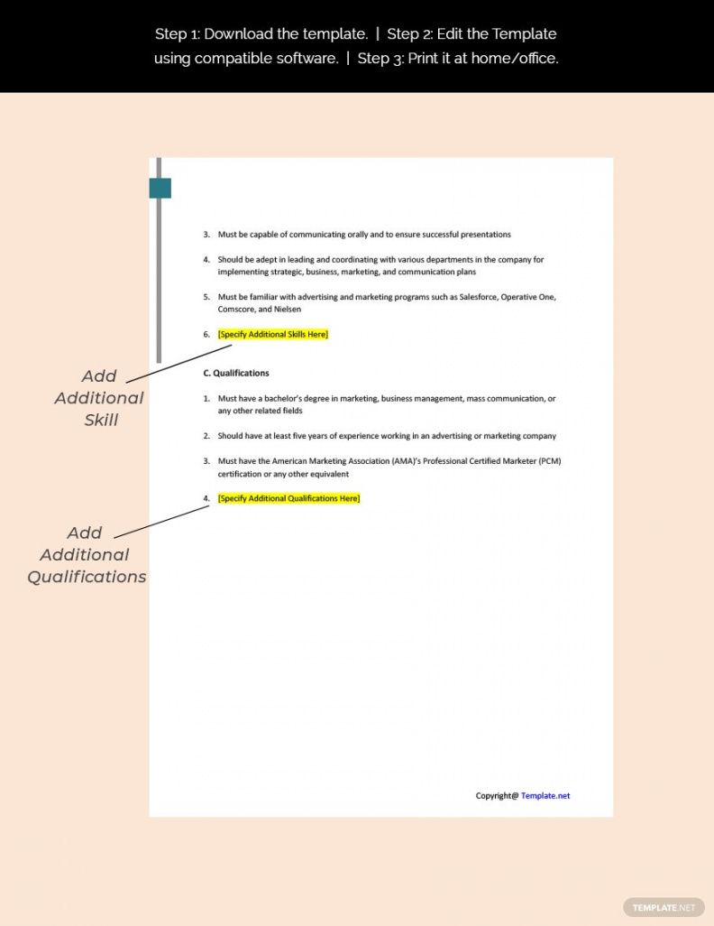Marketing manager job description template, One of the various responsibilities of a human resources specialist, hiring fresh capable employees is among the most crucial. After carefully assessing the competency model your organization requirements, you’ll be able to determine the particular qualities that prospective workers should possess – the abilities and qualities which are most important to a function or another. As soon as you’ve carefully created your hiring criteria, the upcoming essential step is the description.