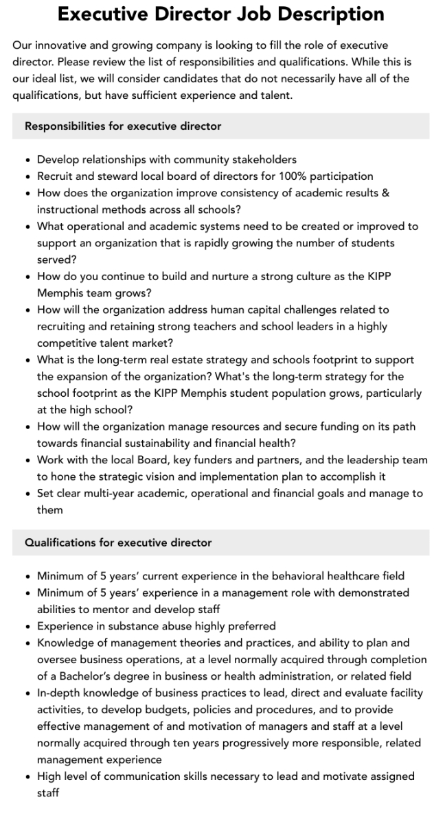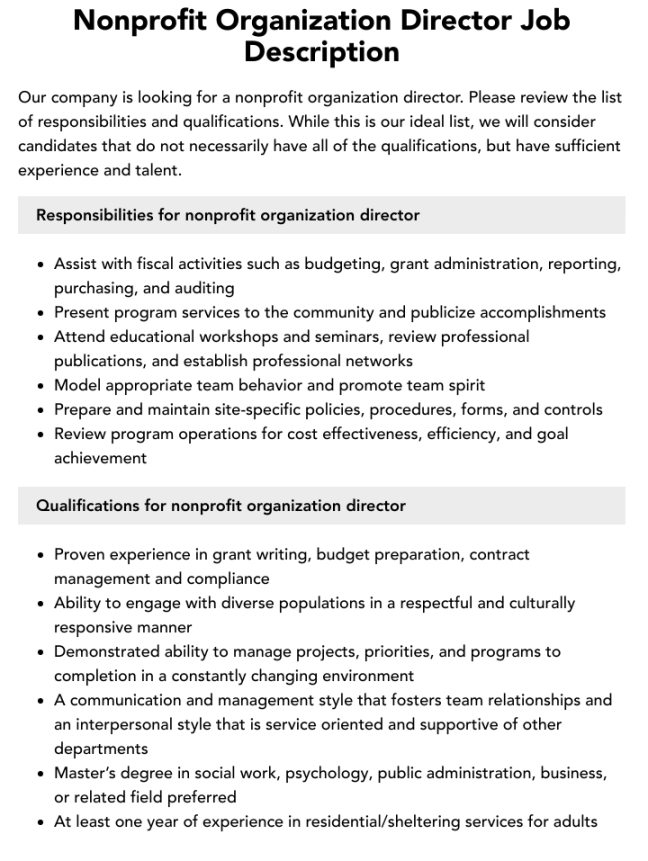 Nonprofit executive director job description template, Job outline is an essential part of every task in every organized working environment. Writing and compiling project descriptions is another very important job of an Human Resources individual in a company. It’s extremely important because it insures details of the day-to-day responsibilities expected from every worker in all sections of a given firm. While writing job descriptions for every position, it must cover such areas as abilities, tasks, purposes and general responsibilities to be performed by employees of that department.