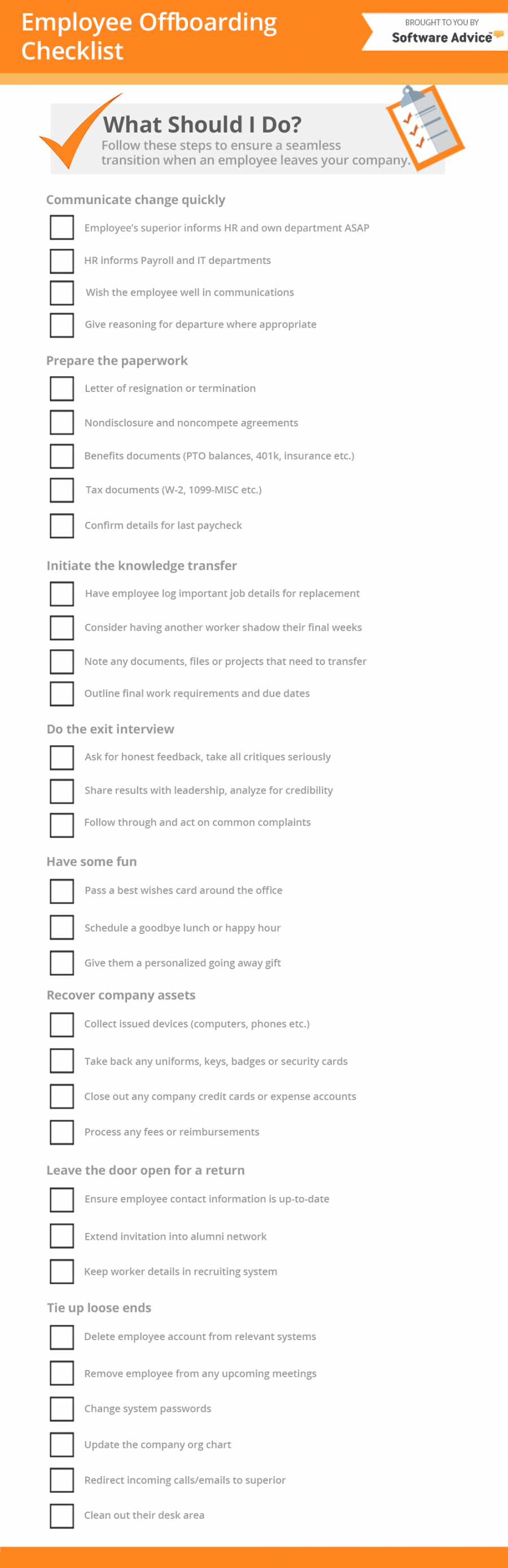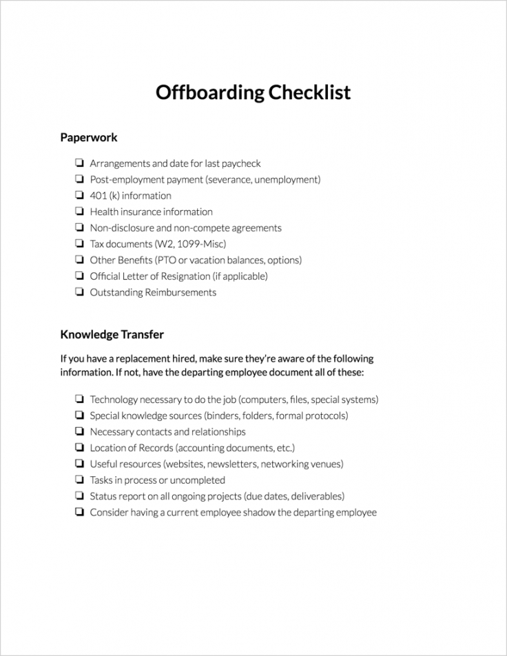 Offboarding checklist template, For most of us life is a constant struggle to remain organized, we compose lists of the things we need to and when we will need to get them done. However, when the tasks we have to get done get a bit more complex a good checklist may come in handy to ensure everything gets done properly. With a template for a checklist you may create comprehensive lists which have groupings of particular activities and checklists to make certain that you get every job done in the appropriate order and lessen the possibility of mistakes being made.