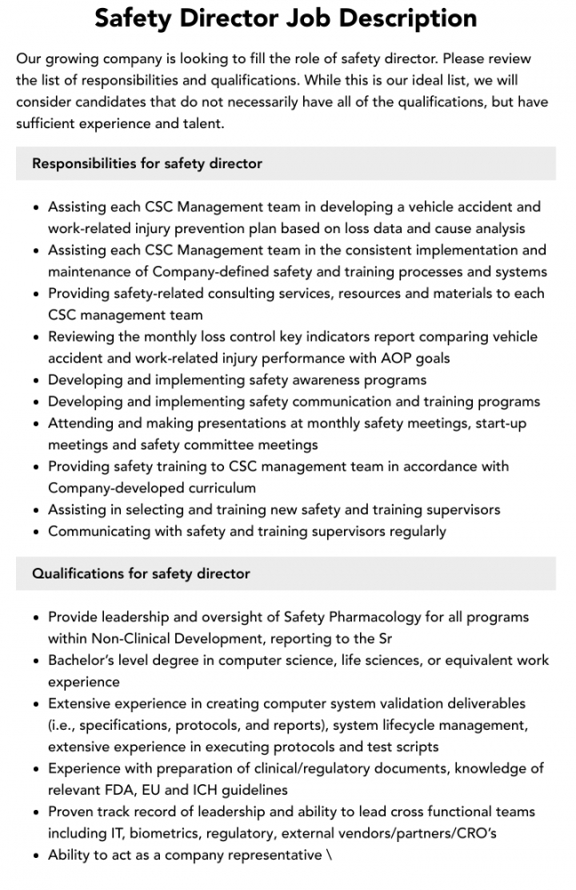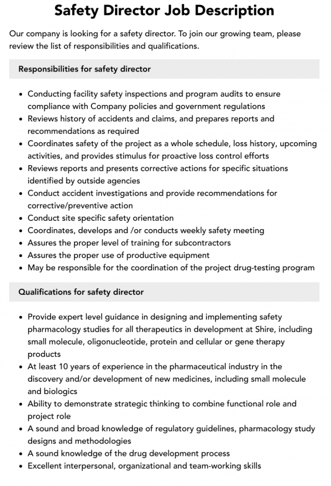 Safety director job description template, One of the various duties of a human resources expert, hiring fresh competent employees is one of the most important. After carefully assessing the competency model your organization demands, you’ll have the ability to determine the specific qualities that prospective workers must have – the skills and qualities that are most crucial to a particular function or another. When you’ve carefully established your hiring standards, the next essential step is this description.