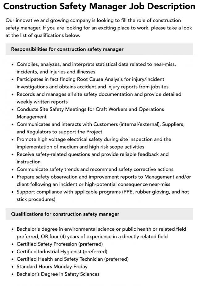 free construction safety manager job description  velvet jobs safety director job description template doc