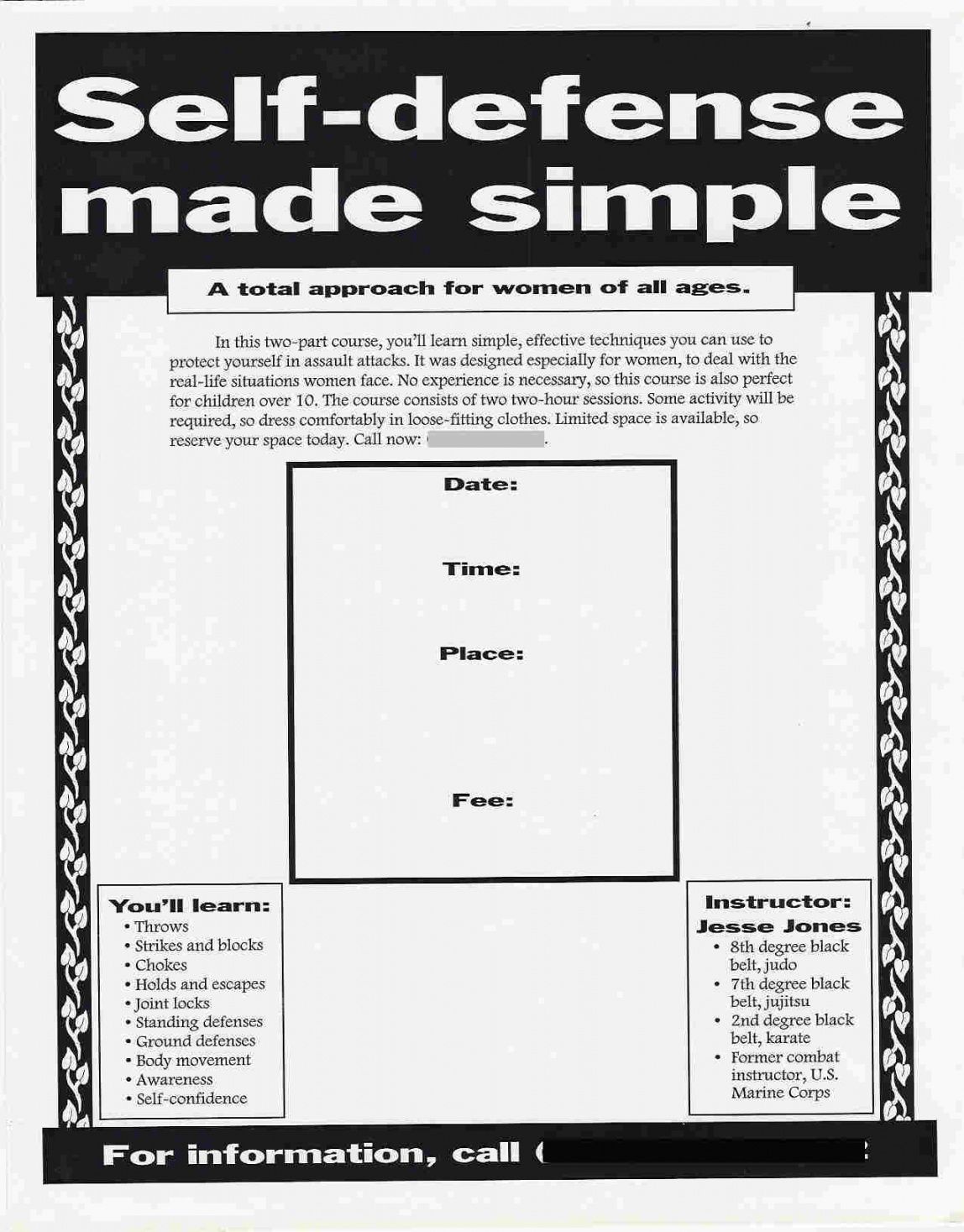 Self defense class flyer template, Flyers are an important marketing tool for many kinds of companies. Firms, be it small or moderate or large, need to be promoted and advertised. For those needs, you will find flyers, which function like a communication between the organization and the prospective customer. Flyer printing is therefore, quite crucial for company point of view. It entails displaying every detail about the company, together with the message that is to be routed across. They’re printed with the aim of advertising or promoting the provider’s latest offerings and discounts, etc.. Flyer printing, thus involves putting the proper information in the ideal manner.