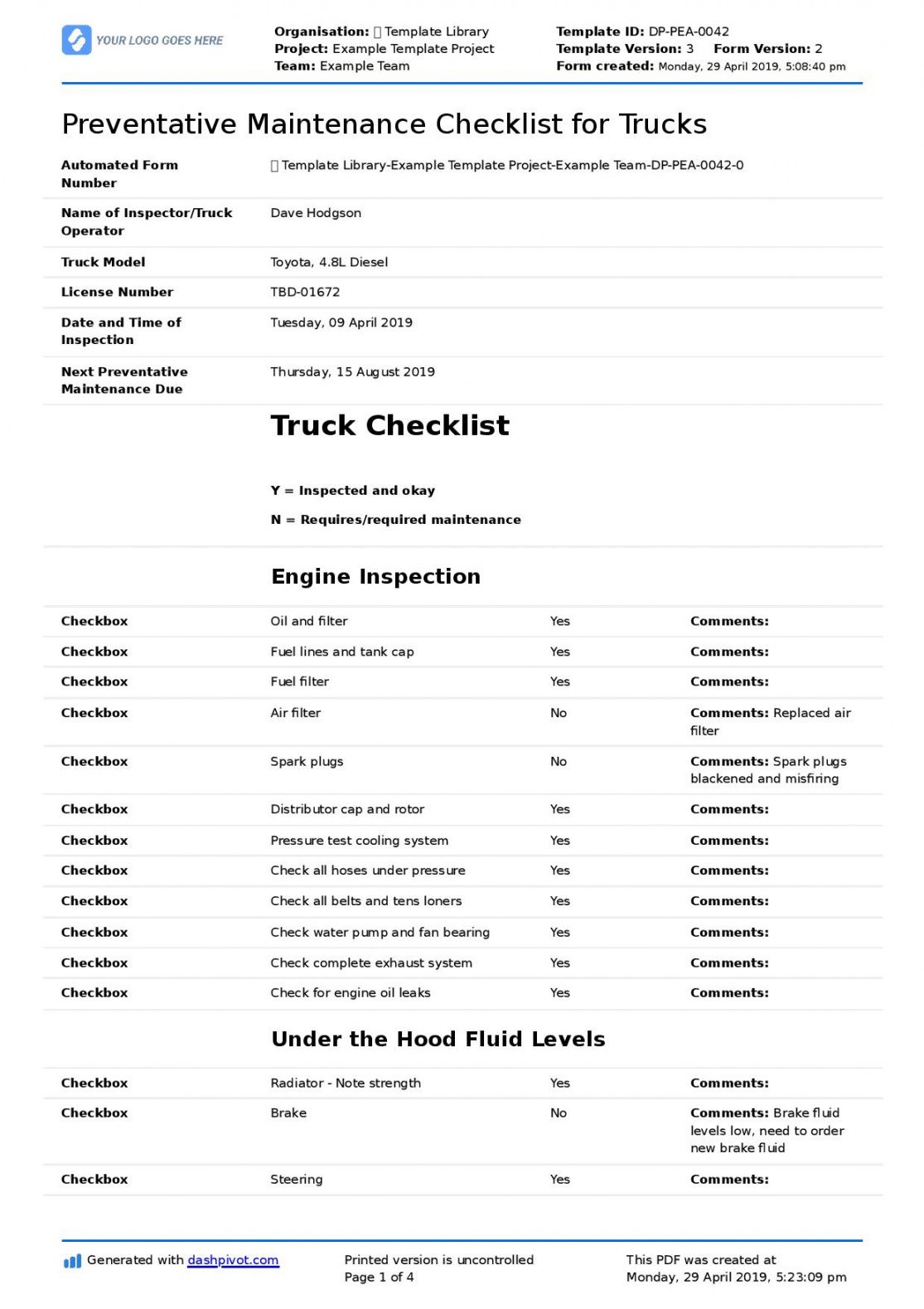 Truck maintenance checklist template, For a lot of people, as they become older, their needs vary radically. Depending on a person’s age, health and psychological capacity, there may be many things that a senior simply can not keep up with the way they used to, or several things a Boomer doesn’t have (can you say”Advanced Directives”) and doesn’t know they need until it is too late. We think that among the best ways to get boomers prepared for their futures, as well as to maintain seniors organized in the present, is by equipping them with checklists that cover major areas of their life. We think that while checklists might not have the moment details laid out (checklists are meant to deliver succinct advice), they’re an excellent planning tool that provide people a macro-view of what has to be learned, gathered, ready, and ultimately implemented, especially when planning for the unexpected moment; moments where without a strategy set up becomes a crisis situation.