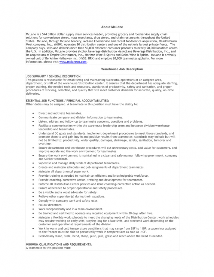 Warehouse supervisor job description template, Job descriptions are imperative to your business since they define job duties and expectations. Job descriptions may be used in several of ways in your enterprise. First, a description will enable a candidate decide if the task is of attention. Secondly, the description will allow you to interview the candidate to decide if the candidate is suitable for the position. The job description can help you in educating new employees. Last, the outline forms the backbone of your test and inspection procedure.