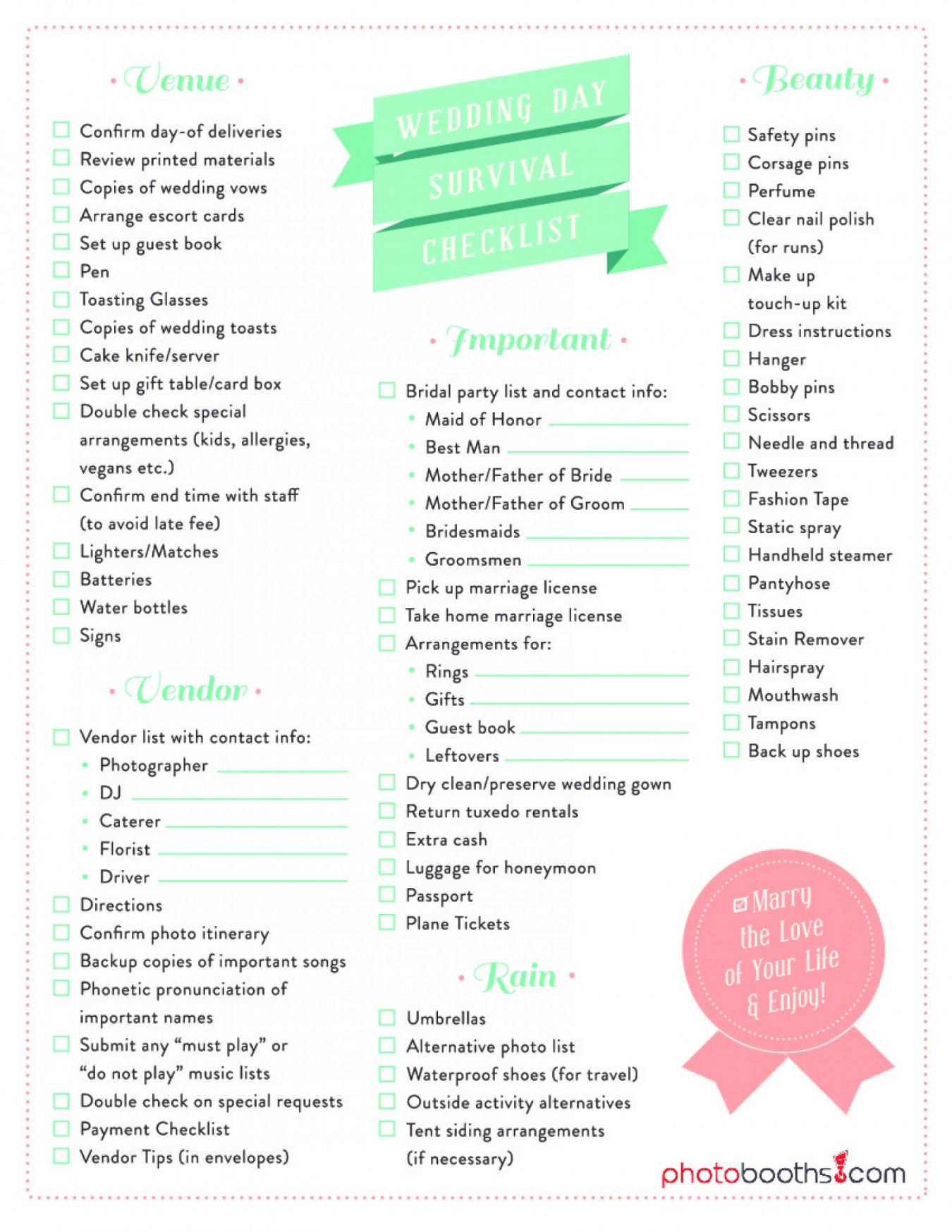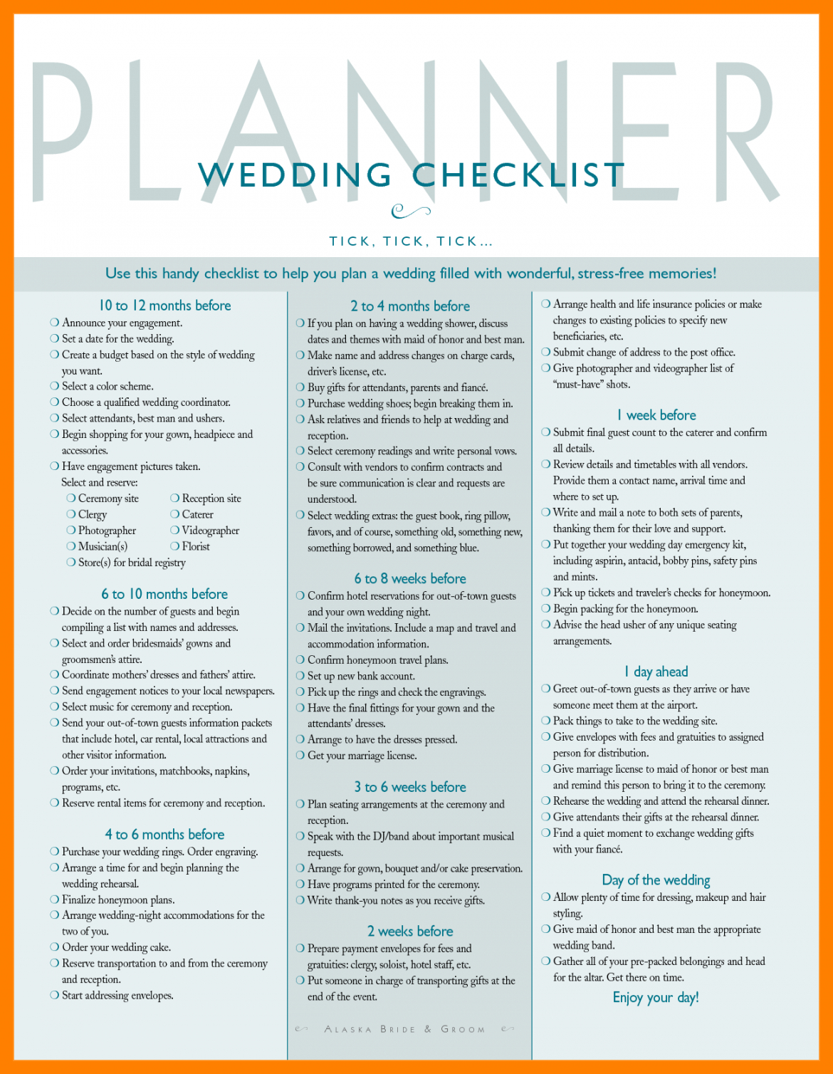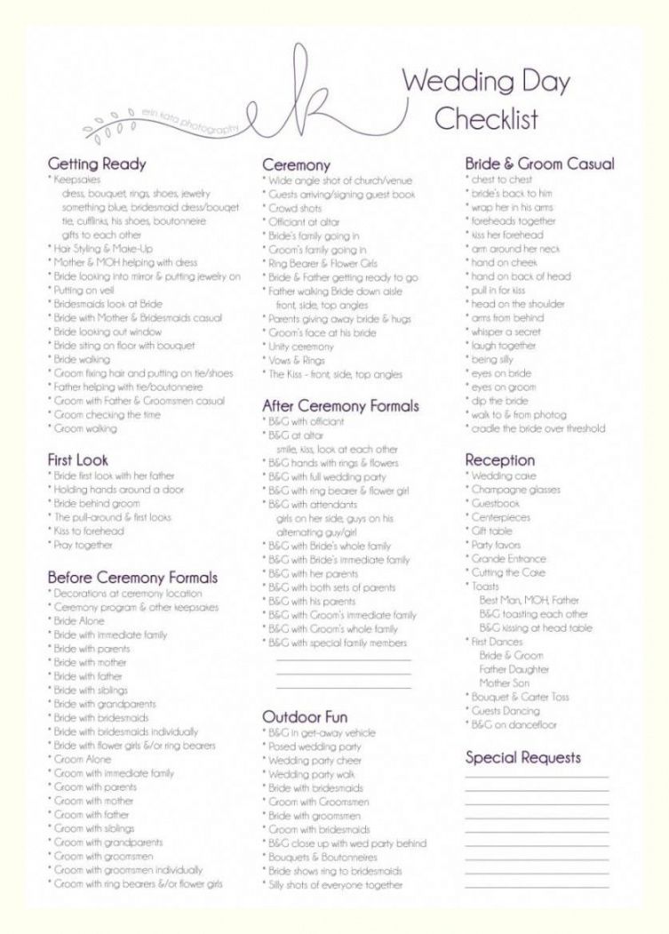 Wedding day checklist template, For many men and women, as they get older, their needs vary dramatically. Based upon a individual’s age, health and mental capacity, there might be several things that a grownup just can not keep up with exactly the way that they used to, or several things a Boomer does not have (can you say”Advanced Directives”) and doesn’t know they need until it’s too late. We think that one of the most effective ways to get boomers prepared for their futures, and to maintain seniors organized in the present, is by equipping them with checklists that cover major regions of their life. We believe that while checklists might not have the moment particulars laid out (checklists are supposed to deliver succinct advice), they’re a great planning tool that give people a macro-view of what has to be learned, gathered, ready, and ultimately executed, particularly when planning for the most unexpected moment; seconds where with no strategy set up becomes a crisis situation.