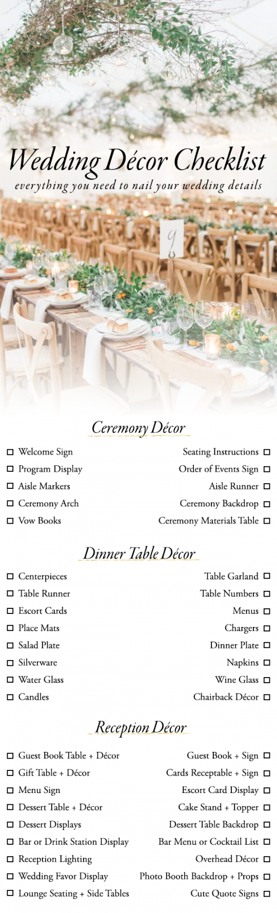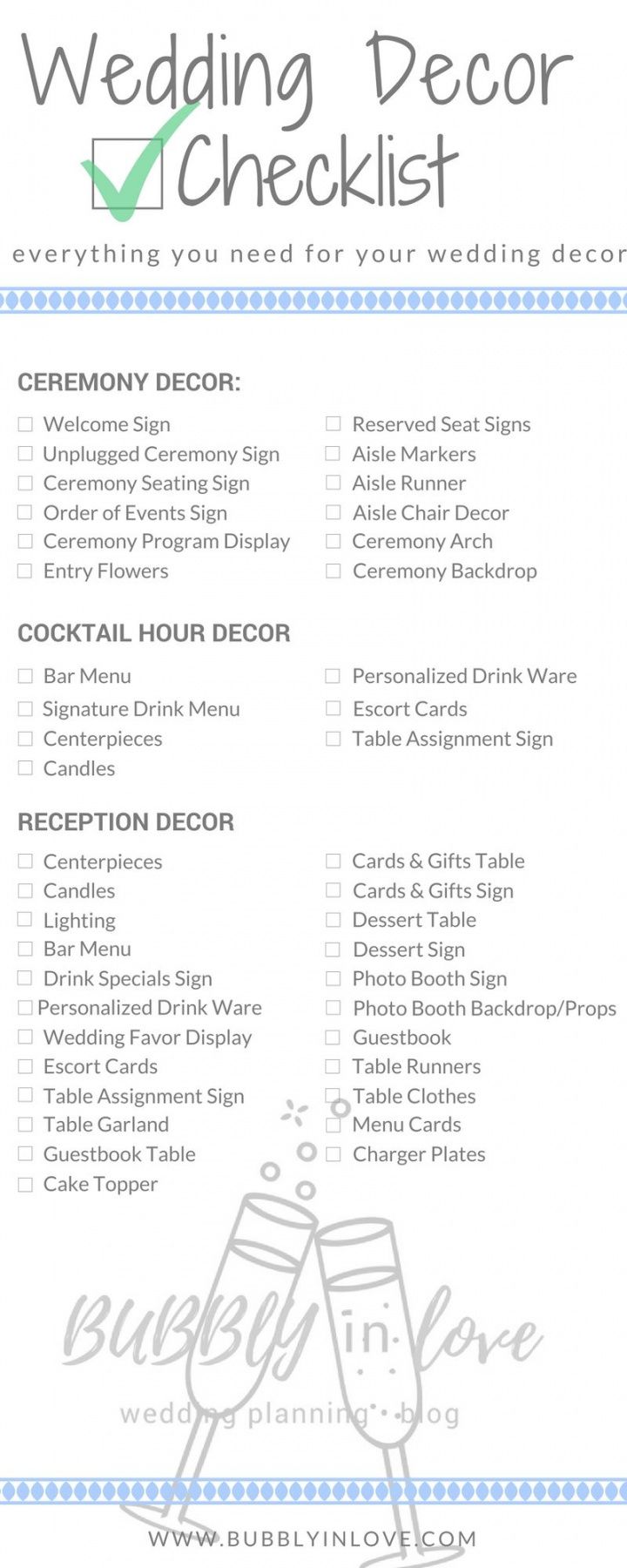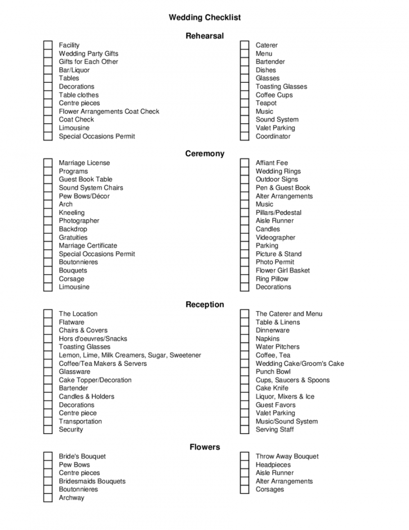 Wedding decoration checklist template, Historically, checklists were straightforward to-do lists that functioned as reminders; attend the sales conference, fax or mail the contract to a client, or distribute an employee memo. Even today, most dictionaries define a checklist as a record that acts as a reminder for a collection of tasks to be completed. But, checklists have evolved into important business management tools that do much more. Along with record action items, checklists are effective business processes that enable organizations to grow and progress systematically, and in a planned way. They’ve become important organizational tools for business ventures.