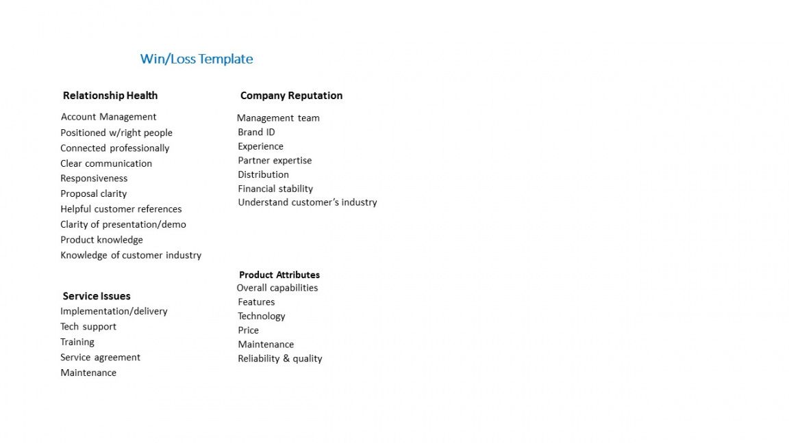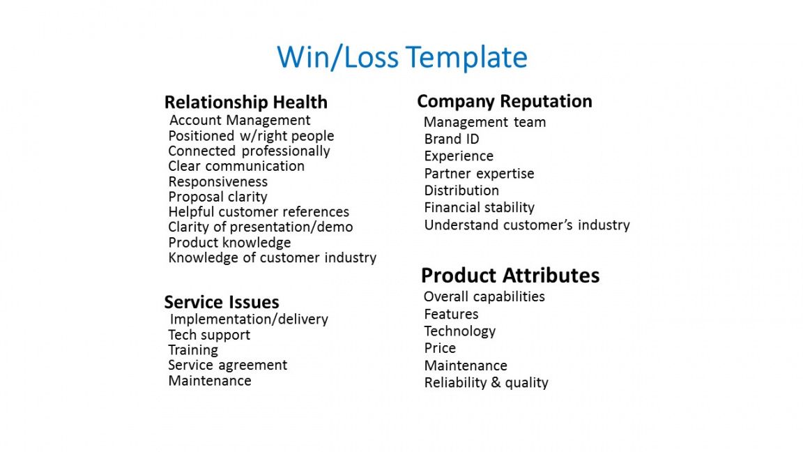 Win loss analysis template, Nowadays, companies need effective business analysis so as to maintain competitiveness in an extremely competitive business world. Successful small business analysis entails taking information accumulated from a variety of resources and assessing for the purpose of forecasting future trends, finding ways to make improvements in business strategies, improving companies operations, and making smart business decisions to improve your organization’s bottom line. Knowing key marketing areas is essential to helping a company create revenue and cut down on excessive waste.